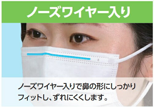 3層構造で飛沫・ほこり・花粉をカット! ノーズワイヤー入りで鼻の形にしっかりフィットし、ずれにくくします。
